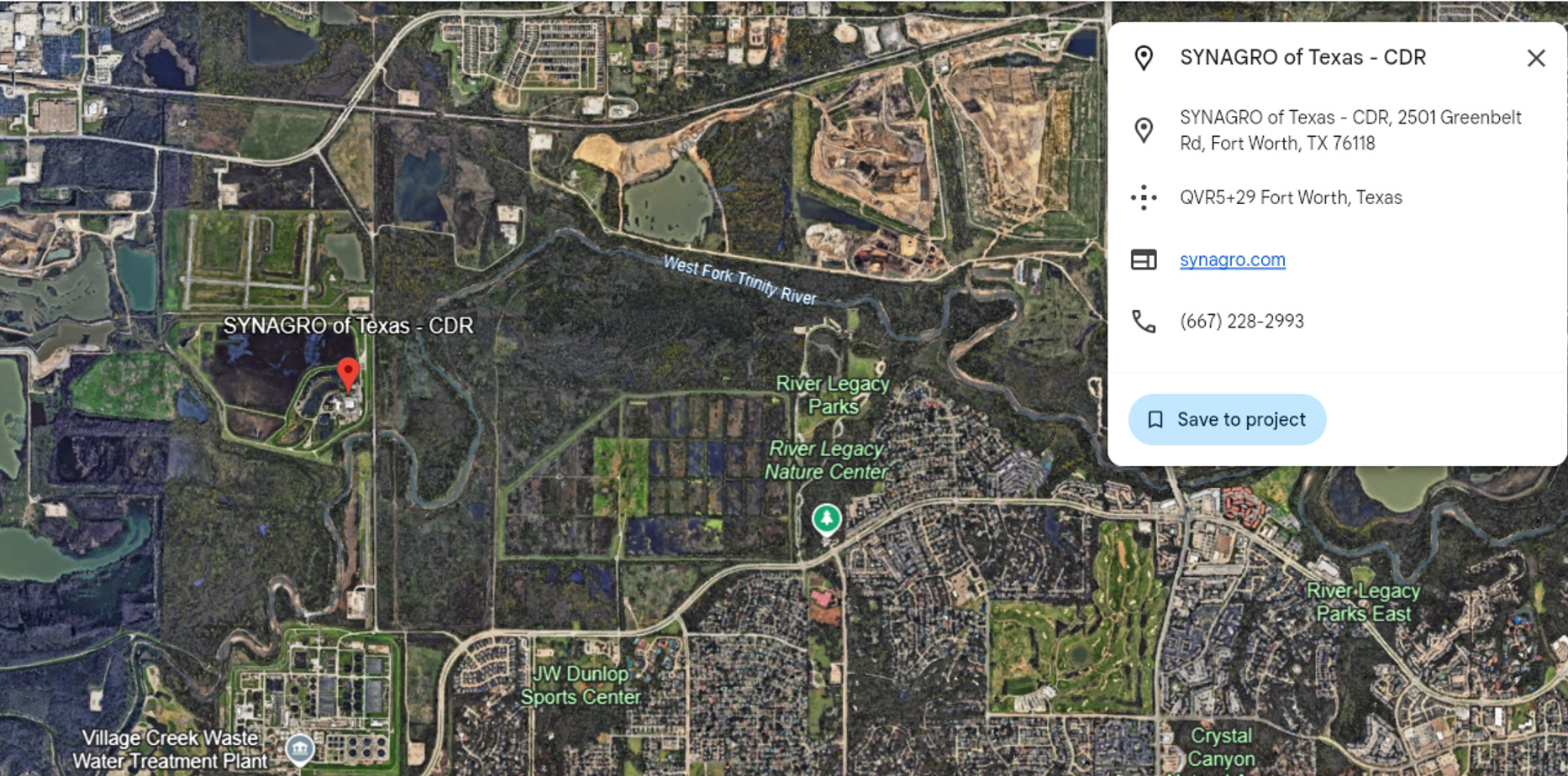 The biosolids purchased from Synagro originated from a Fort Worth Waste Water Treatment Plant. The same PFAS contaminated Fort Worth biosolids are composted by spreading them on the ground on the banks of the West Fork of the Trinity River. (see image below)
